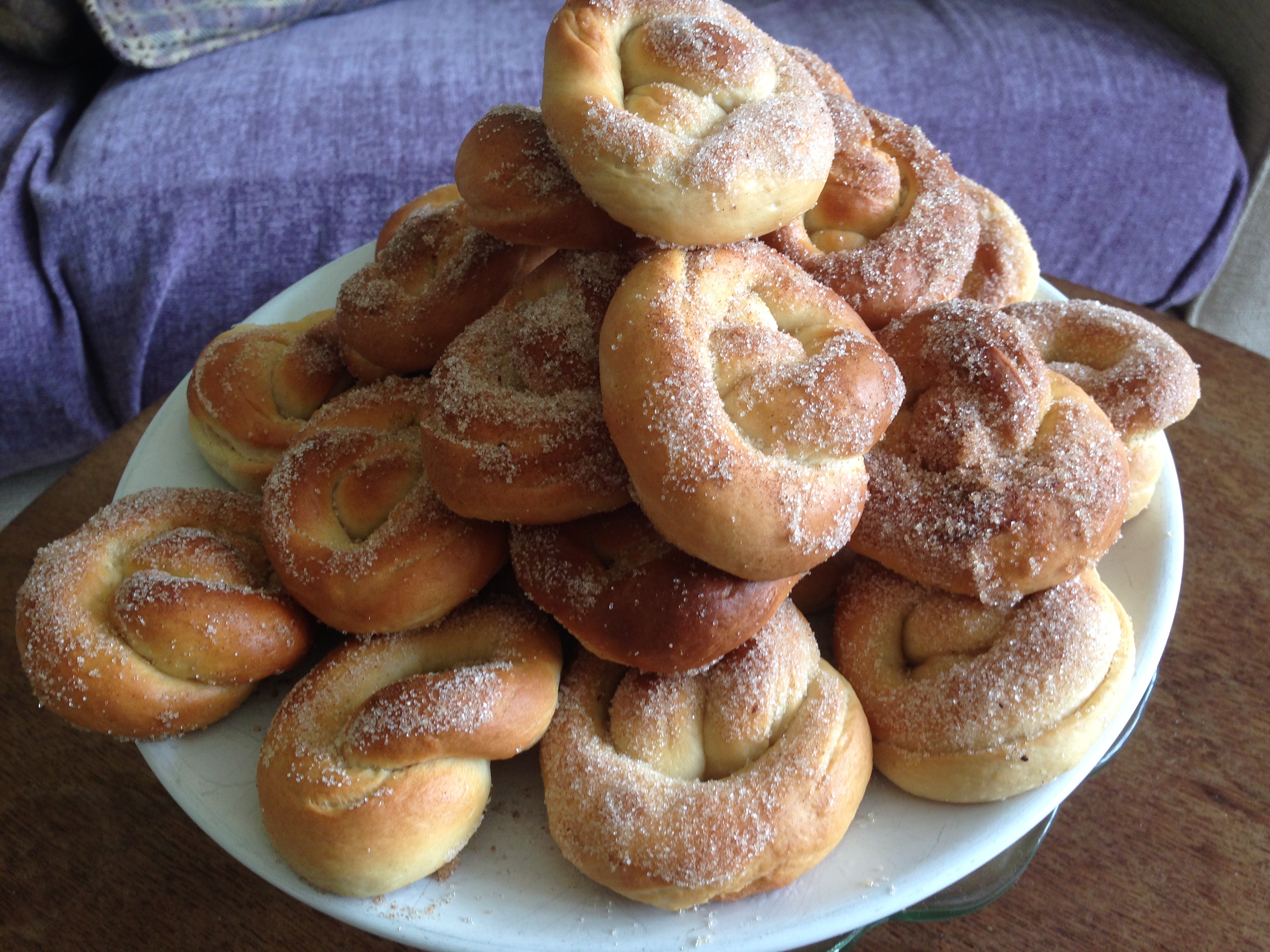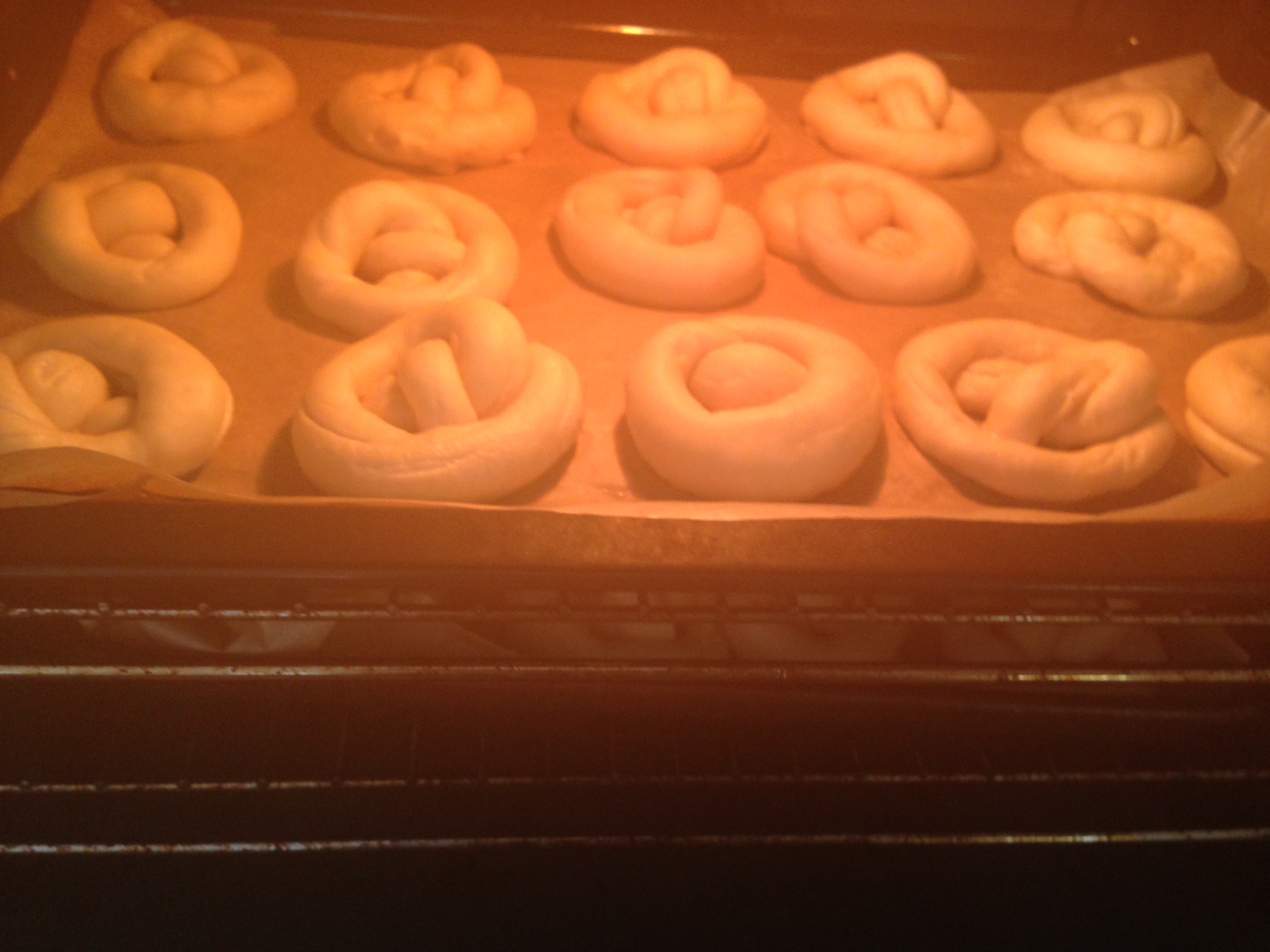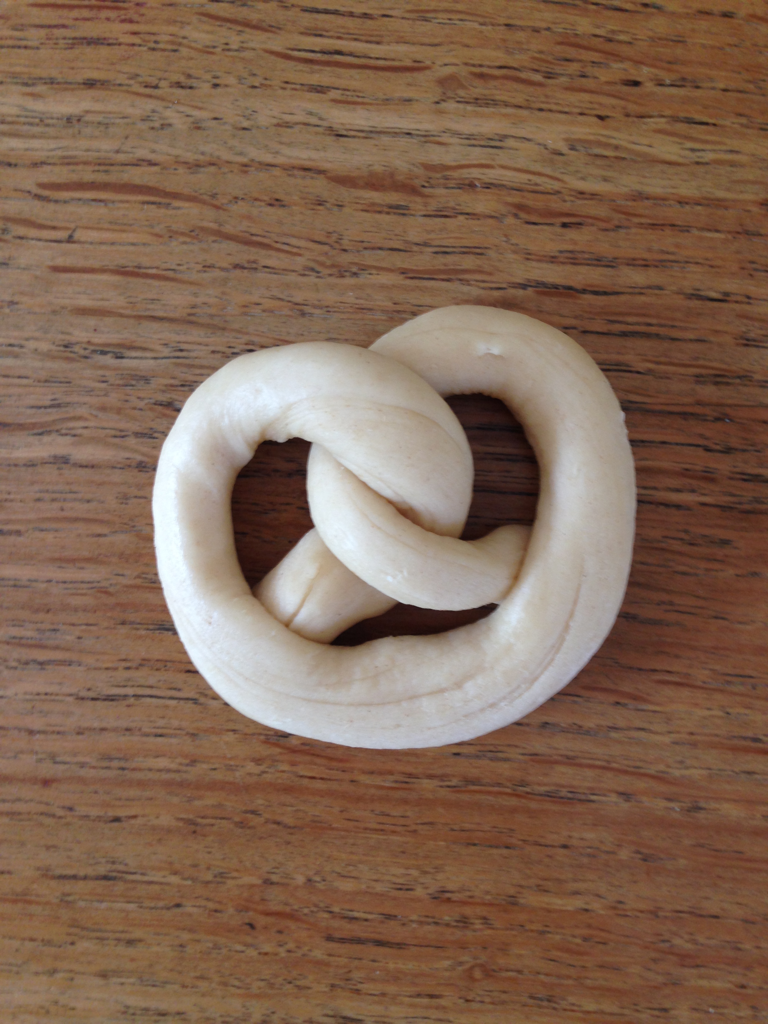 The dough puffs up during the bake so make sure the pretzel shape is quite distinctive. Take an end of the snake in each hand and quickly cross your hands so that the dough knots twice and creates a noose. This is a little fiddly so you might want to keep the dough on the table, cross your hands to create one twist then create another with your hands.