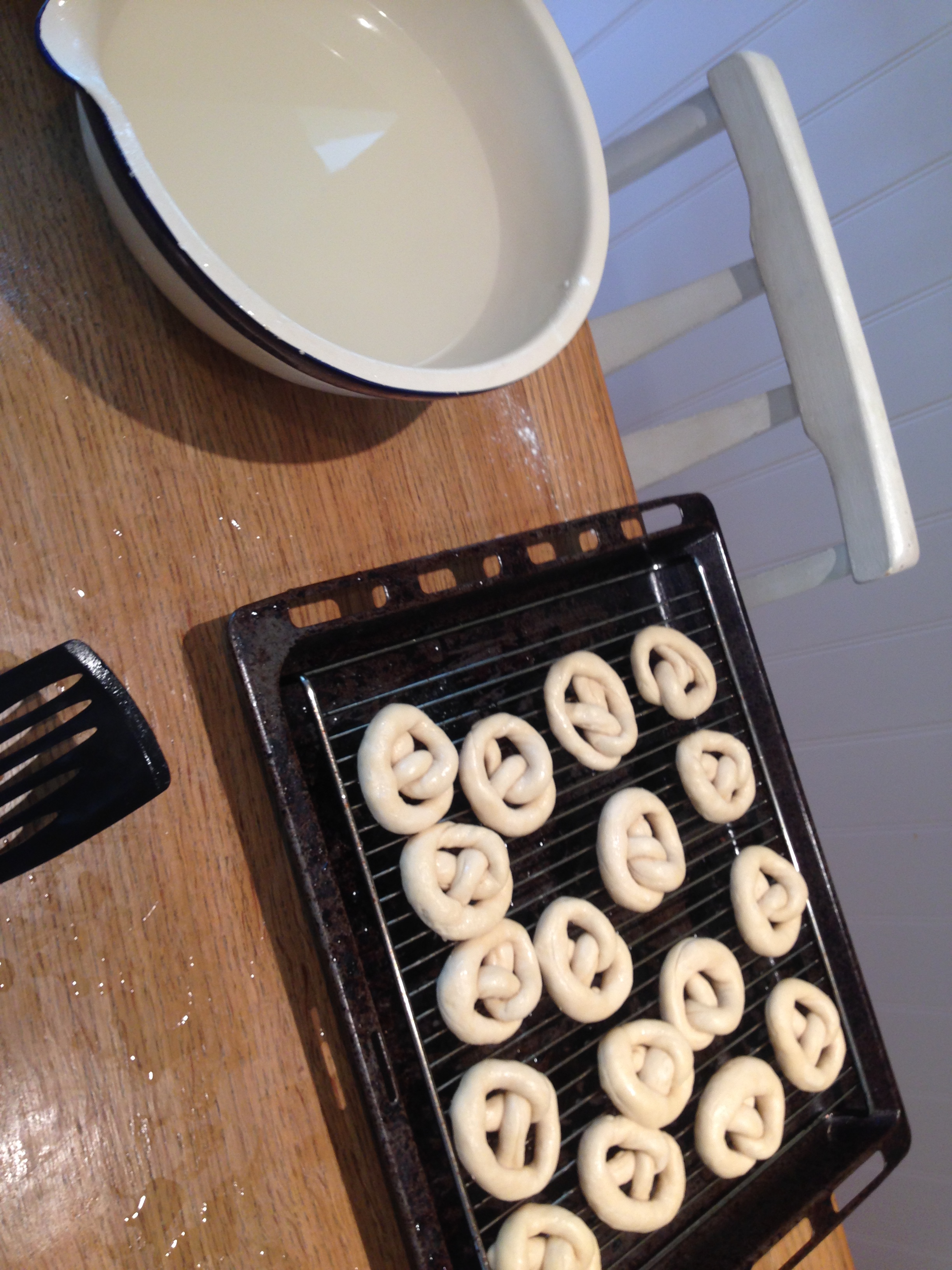 Fill the saucepan with water and when gently bubbling add the bicarb. Take a pretzel on your spatula and dip it into the water for a couple of seconds, shake off the excess and add onto the second greased baking tray. Do this until all of the pretzels have been dunked.