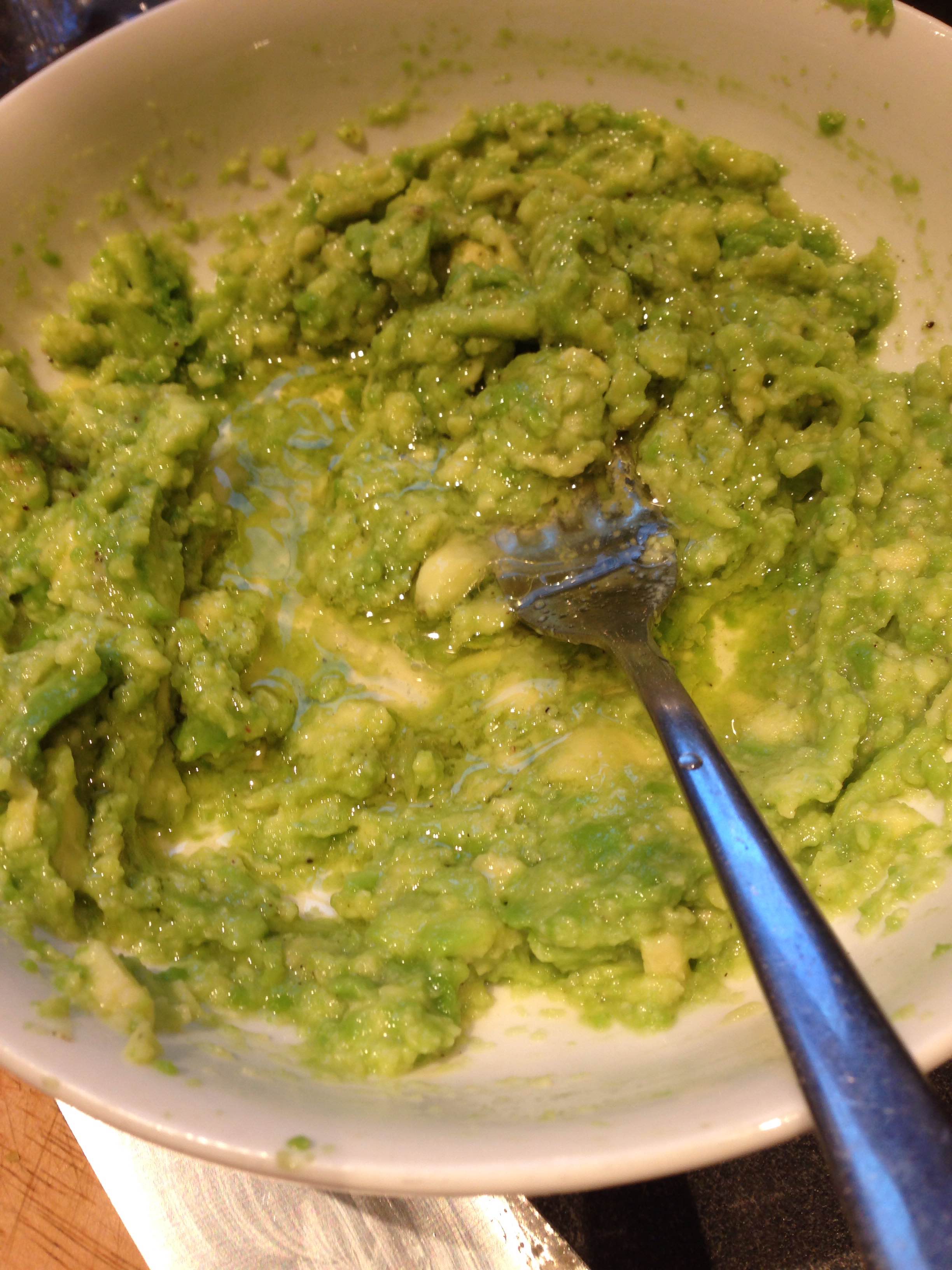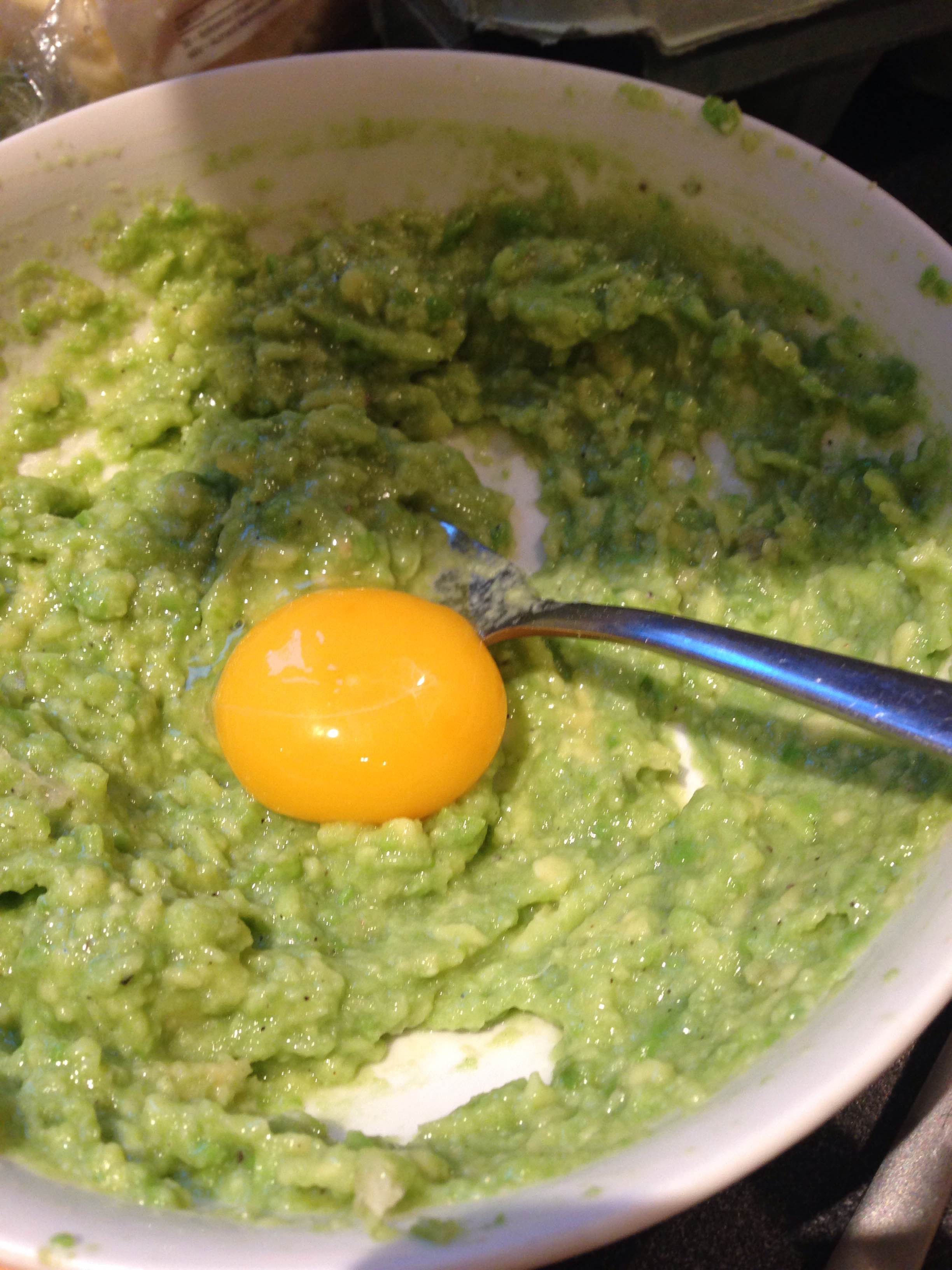 To make the avocado, mash up in the bowl with the lemon juice, cheese, egg yolk salt, pepper and another glug of olive oil.