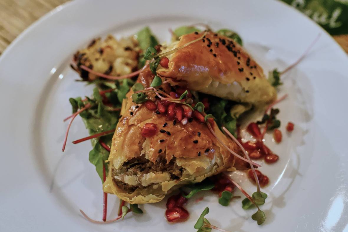 April 2, 2016 12513945_10153426779151232_3914504674501841898_o Lamb and onion samucha, blooming shallot, pomegranate (Photo credit: Paul Monckton)